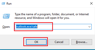 Step 2: In the Run dialogue box, type “Outlook.exe/safe”.