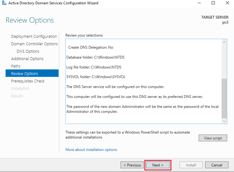 - In the Additional Options window, change the NET-BIOS domain name if required, otherwise leave it as it is and click on the next button.