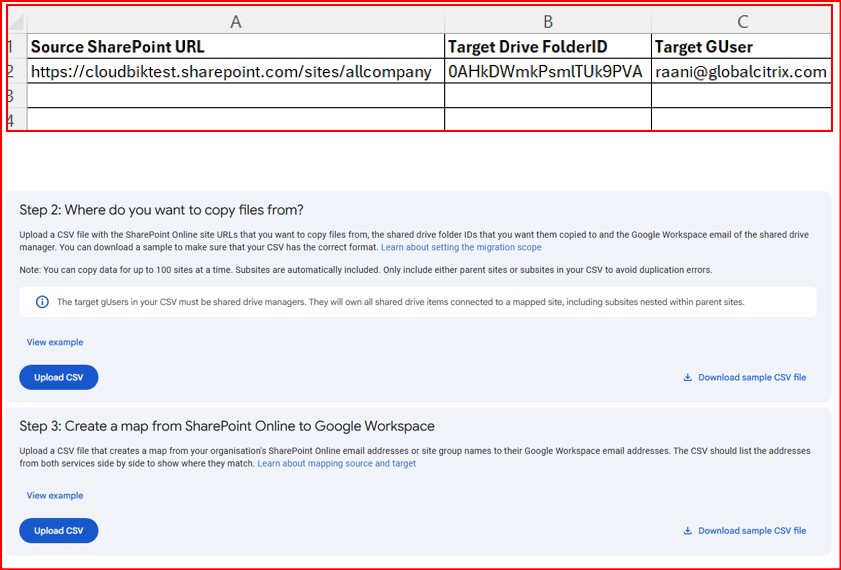 Refer to the screenshot below for guidance. Once you have filled in the required information, upload the CSV file to complete Step 2.