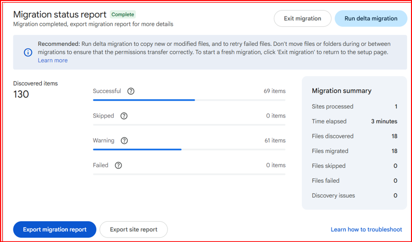Once the migration is complete, you will see two options: Exit Migration and Run Delta Migration.
