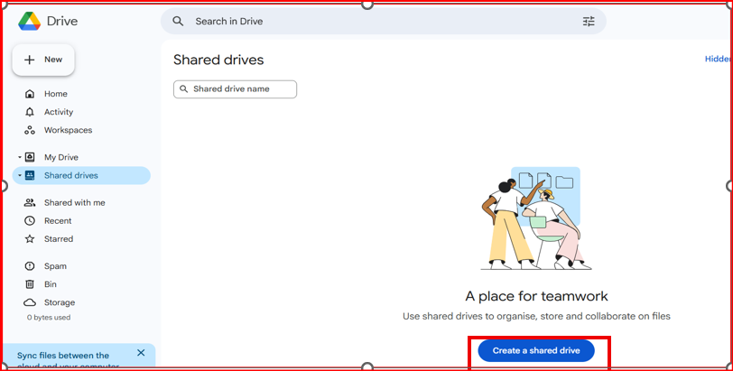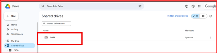 First, log in to the user’s Google Drive account. Then navigate to the Shared drives section. From there, you will see the option to create a new shared drive, as shown in the screenshot below.