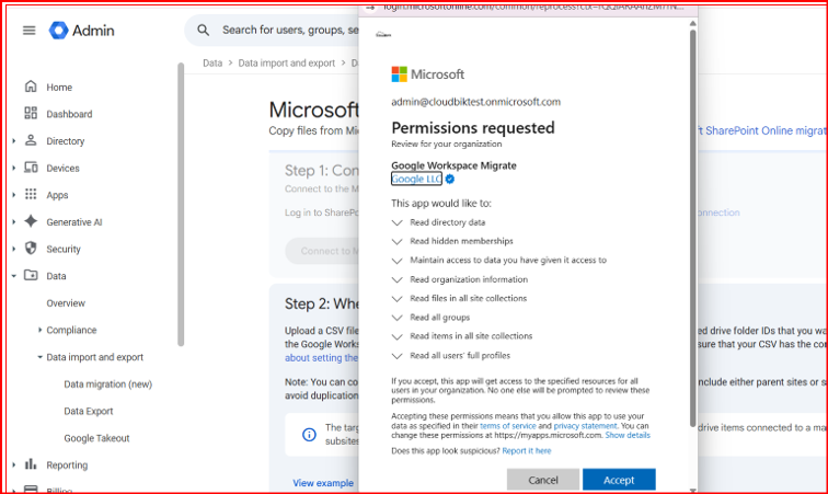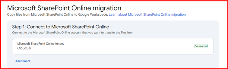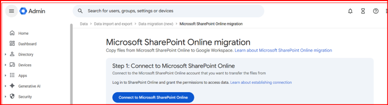 After connecting to SharePoint Online, you have completed Step 1 in the Google Admin Console.